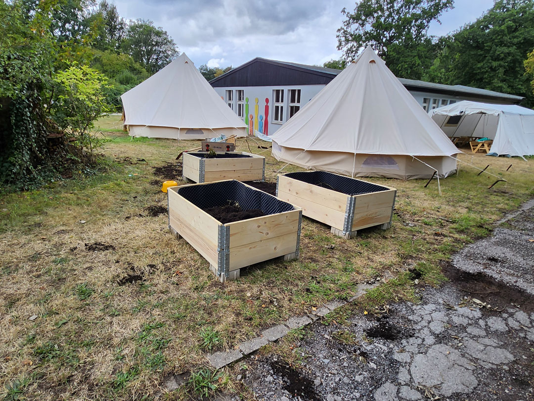 Additionally, we fixed the tents anew so that they are strong for every weather. Furthermore, we built high flower beds. The children enthusiastically helped us and filled the high beds with soil. At least, we built a deadwood hedge to border the individual play areas on the grounds for the children by wildly stacking branches on top of each other.