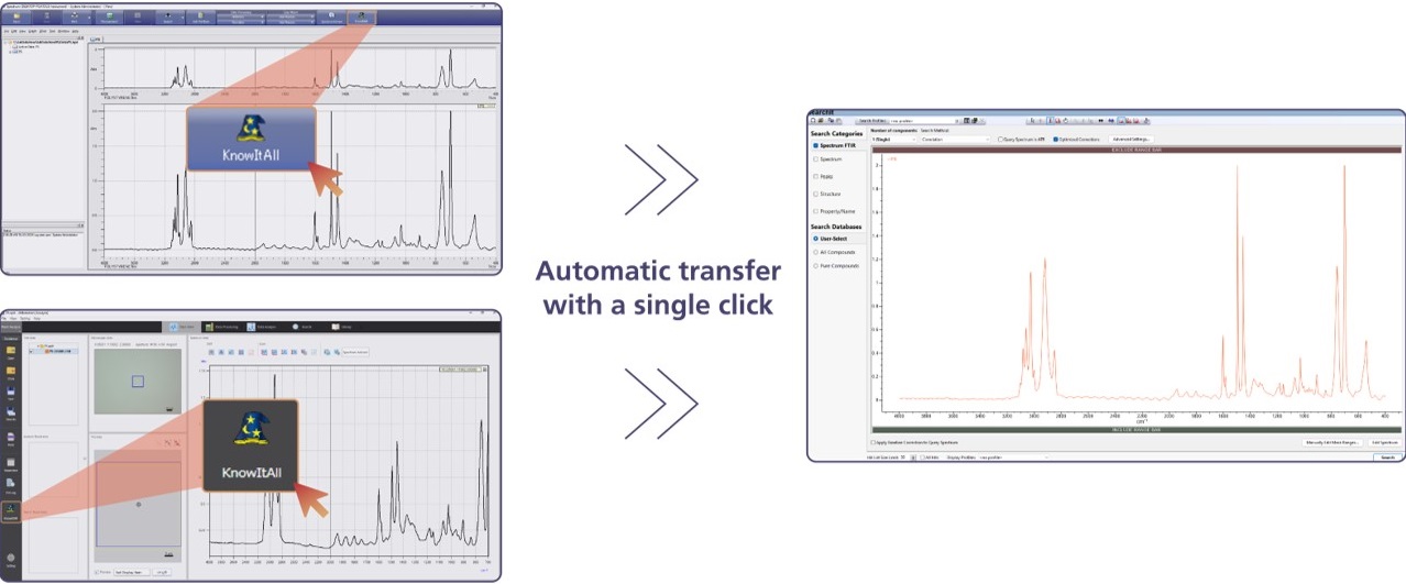 Activate John Wiley & Sons, Inc. KnowItAll from a button in the LabSolutions IR software to automatically transfer the active spectrum. With KnowItAll, you can perform searches using a rich library, analysis of constituent components and constituent ratios by mixture analysis, and functional group analysis by searching for functional groups of specified peaks.