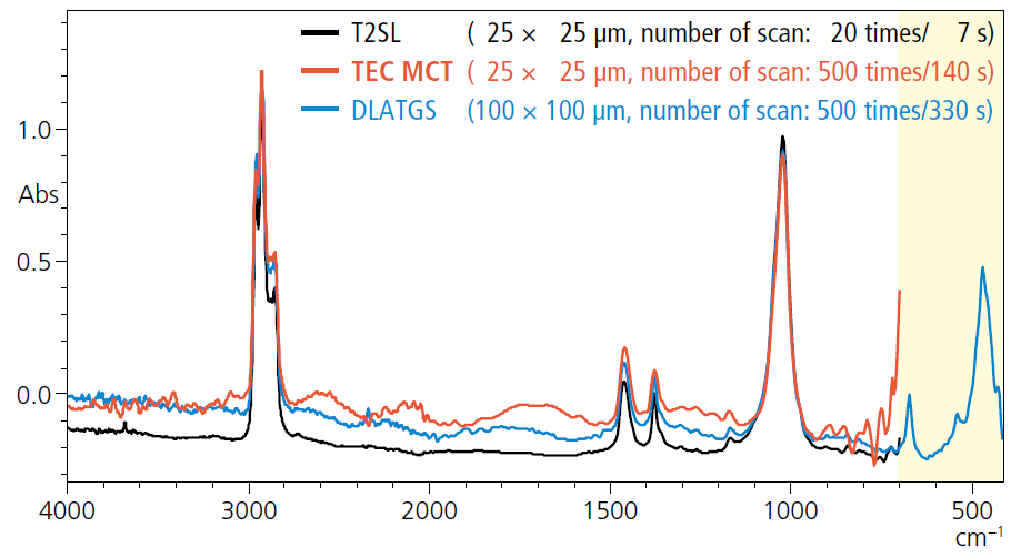 Infrared spectra of polypropylene-based (containing TALC) resin for automotive bumpers are shown to the right to compare the three detectors. The sample was placed in a diamond cell and measured in transmission method. It was measured by the T2SL and TEC MCT with a 25 × 25 μm aperture size, and by the DLATGS with a 100 × 100 μm aperture size. Liquid nitrogen was not used with the TEC MCT, and it is evident that there is a little more noise in the spectrum collected with the T2SL, which does require liquid nitrogen. A larger aperture is needed for data collection with the DLATGS detector due to its much lower sensitivity than the T2SL and TEC MCT. However, the DLATGS does have the advantage of being able to measure the sample in the low wavenumber region (down to 400 cm−1).