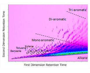 GCxGC provides image patterns that can be correlated to compound structure; this capability is especially useful for grouping analysis of mixtures containing many components.