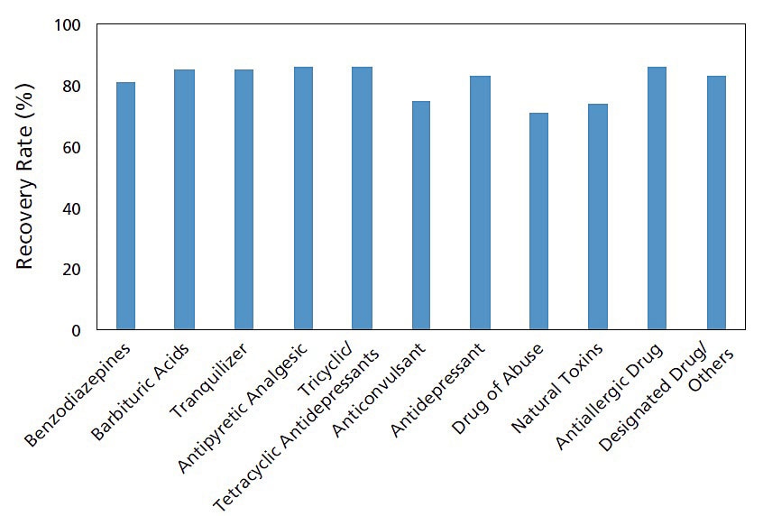 Using the Micro Volume QuEChERS Kit, an additive recovery test was implemented for the main toxicants in whole human blood. The measurements were performed by LC/MS/MS using the HPLC and MS conditions registered in the LC/MS/MS Rapid Toxicology Screening System Ver.2. Favorable results were obtained in this experiment, with recovery rates* for all compounds ranging from 71% to 86%. Using the Micro Volume QuEChERS Kit, impurities can easily be removed, enabling the efficient recovery of a wide range of compounds without loss.