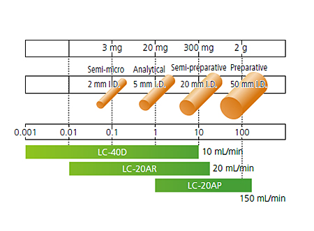 The solvent delivery unit and fraction collector can be selected to suit the recovery volume. Sample introduction and reinjection options cover a wide range of uses. Additionally, the Shim-pack™ Scepter columns feature excellent scalability from analytical to preparative separations with a variety of phases for different applications.